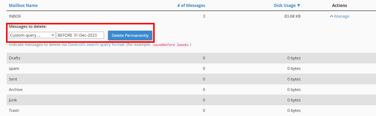 For custom query, if you wish to delete mails before 31.12.2023 you can write a query [BEFORE 31-Dec-2023].